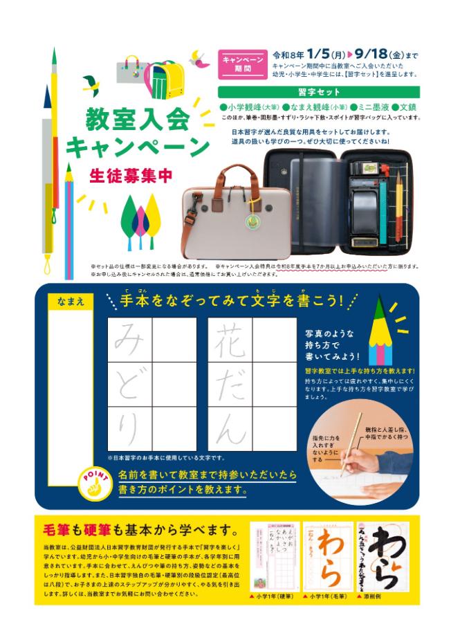 基本的に硬筆・毛筆両方半分ずつの授業内容ですが、学年によって(小学校入学したての方等)は、最初はかきかたを重視して学習する等判断・対応いたします。子供の方は毎回硬筆と毛筆両方をしっかり学習いたします。冬休み等の課題も対応いたします。お気軽に無料体験教室にお越しください。